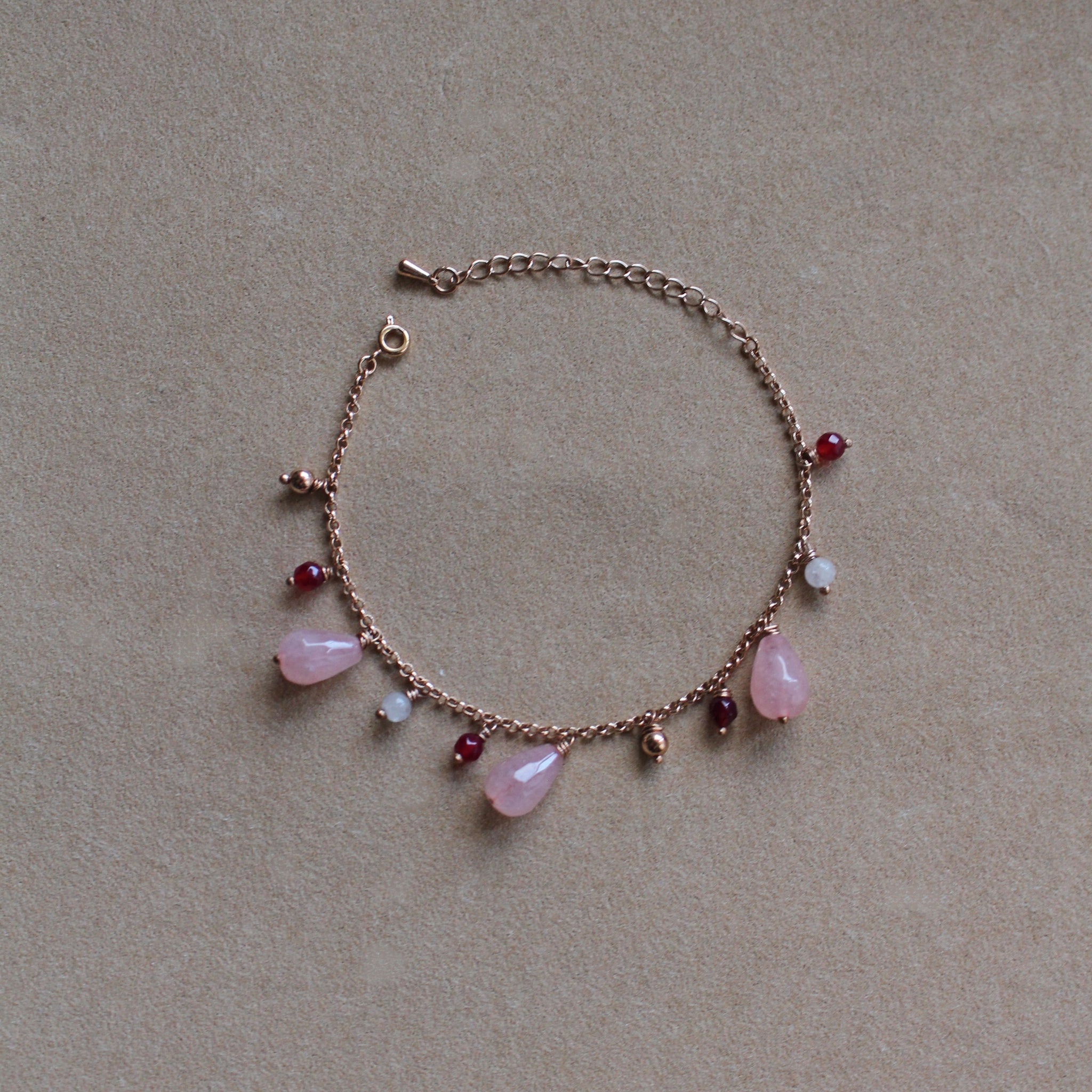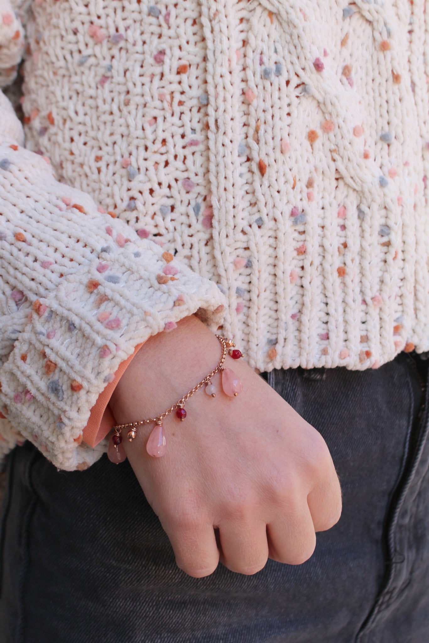 Il bracciale Petalo è estremamente elegante e fine con le sue pepite e pietre pendenti sui toni del rosa. Realizzato a mano.