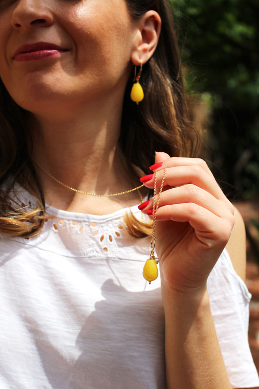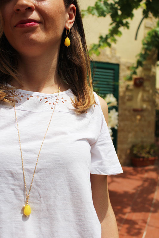 MATERIALI: catena in acciaio, pietra preziosa giada gialla in goccia sfaccettata con gancio in argento 925 placcato oro e perlina di fiume.