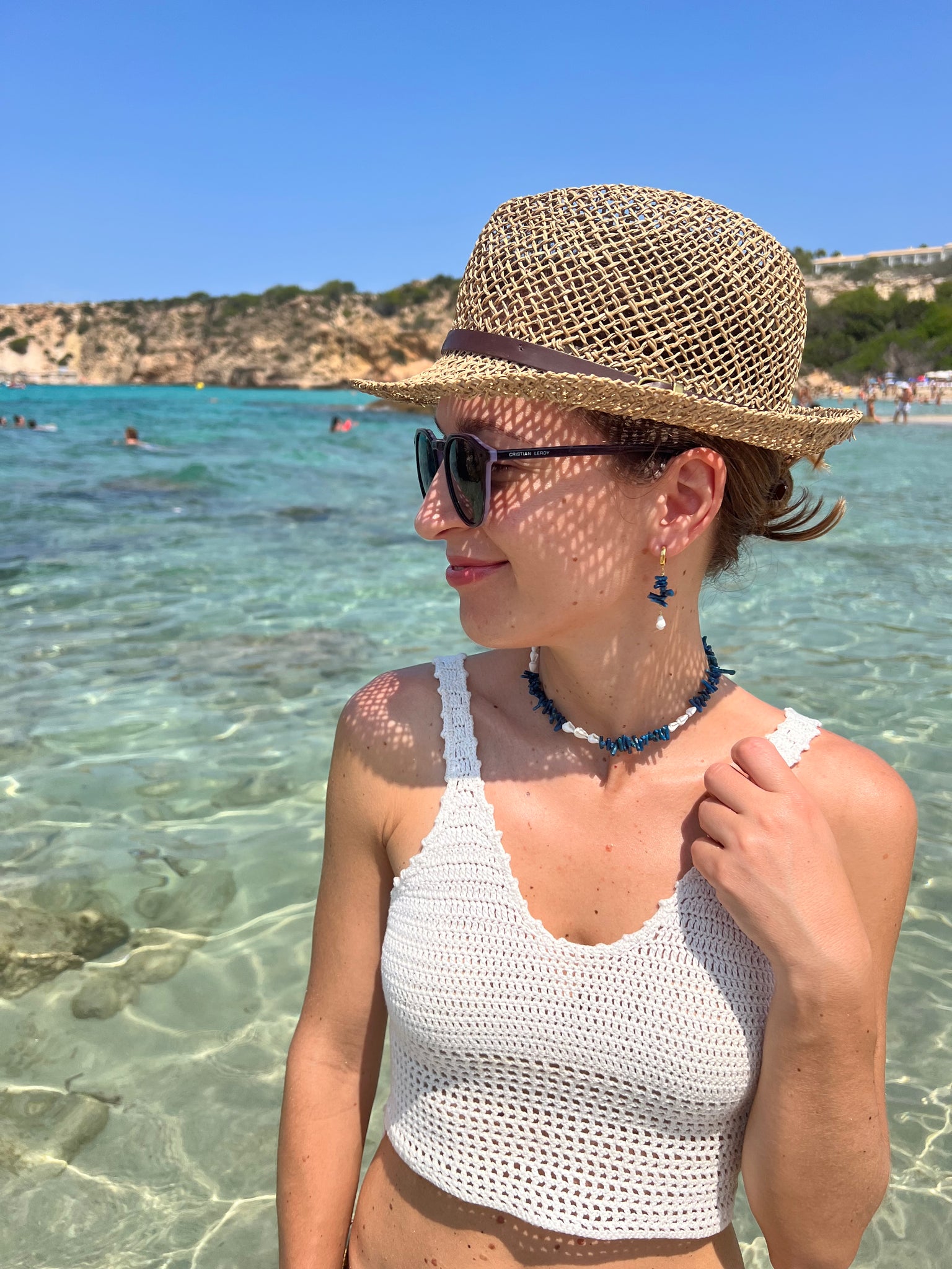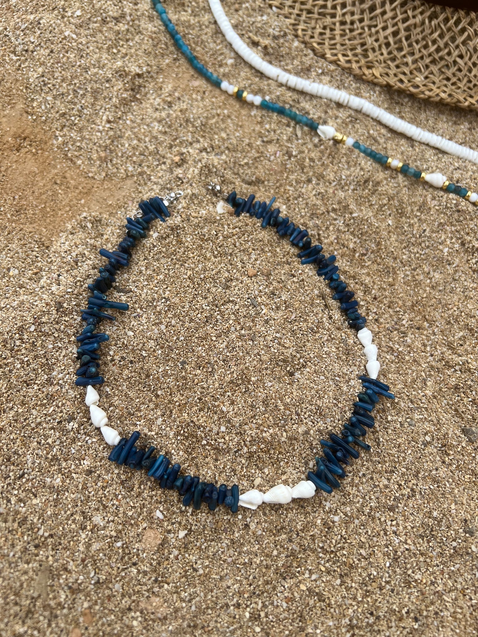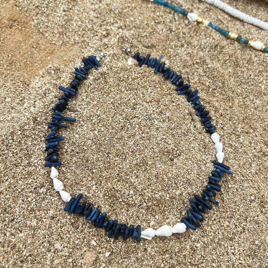 MATERIALI: perle di conchiglia, bambù blu e argento 925