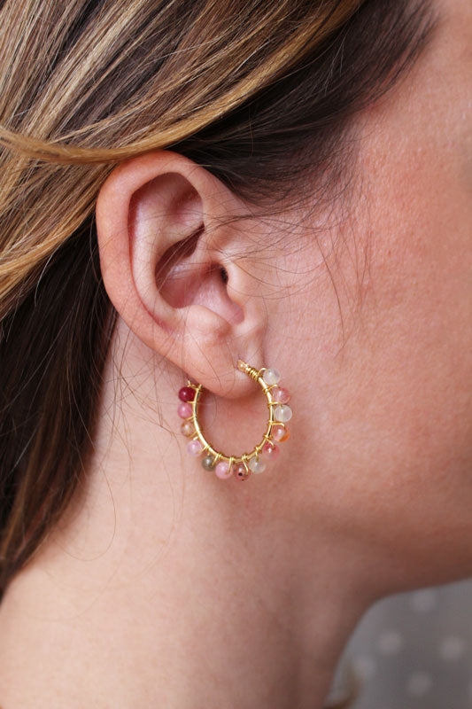 Tutti i colori della primavera racchiusi in una coppia di deliziosi orecchini a cerchio impreziositi da agate multicolor in tutte le sfumature del rosa, del bianco e del verde: i Bubble Primavera.